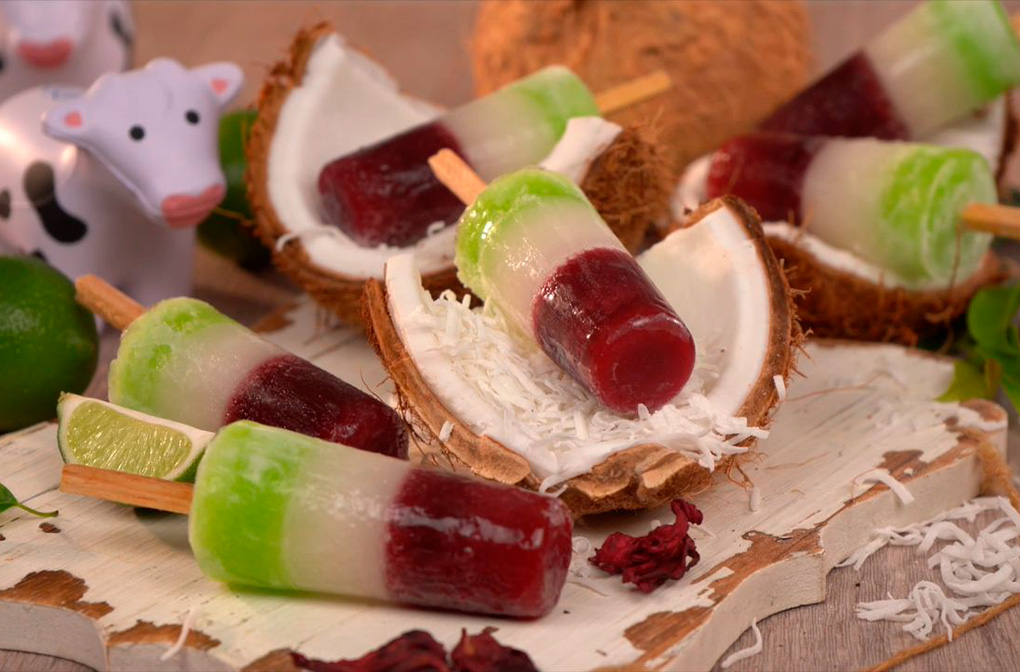 3. Una vez congelada la nieve de jamaica, integra ¾ del molde del preparado de coco.