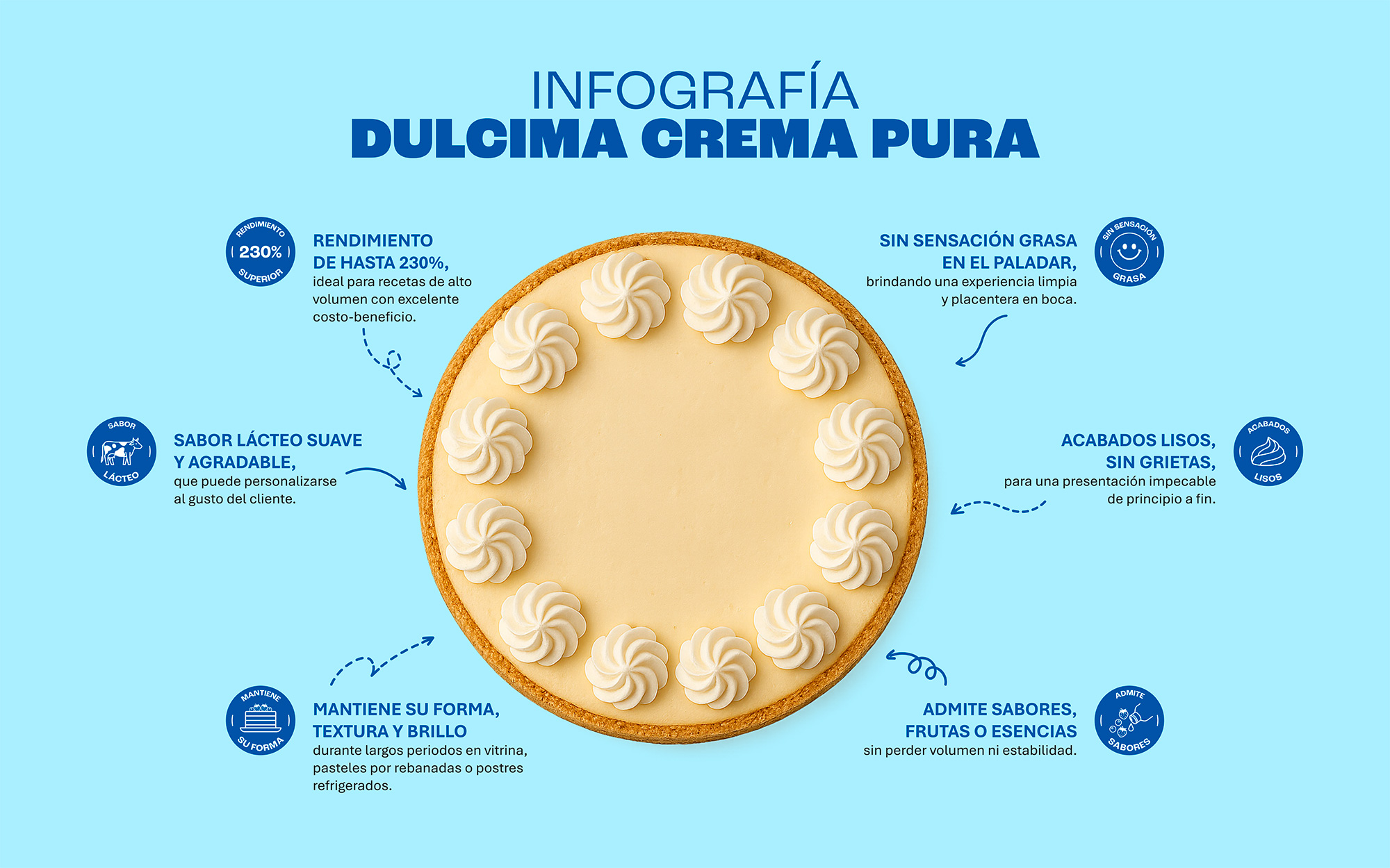 Dulcima® Crema Pura es la solución accesible y versátil para reposteros que buscan sabor lácteo auténtico, rendimiento y facilidad de uso. Lista para batir, permite ajustar el dulzor y mezclar con sabores, frutas o esencias, adaptándose a cualquier tipo de postre.
